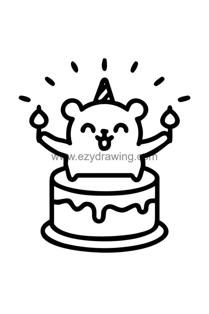 Draw a large round birthday cake sitting in front of a tiny hamster.