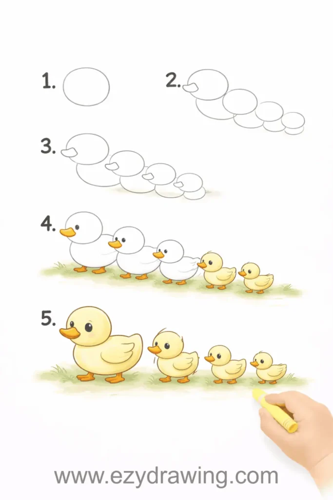 Pro Tip: Number each duck lightly in pencil (1-2-3-4-5) before drawing to help kids maintain proper spacing and size progression, preventing ducks from overlapping unintentionally.