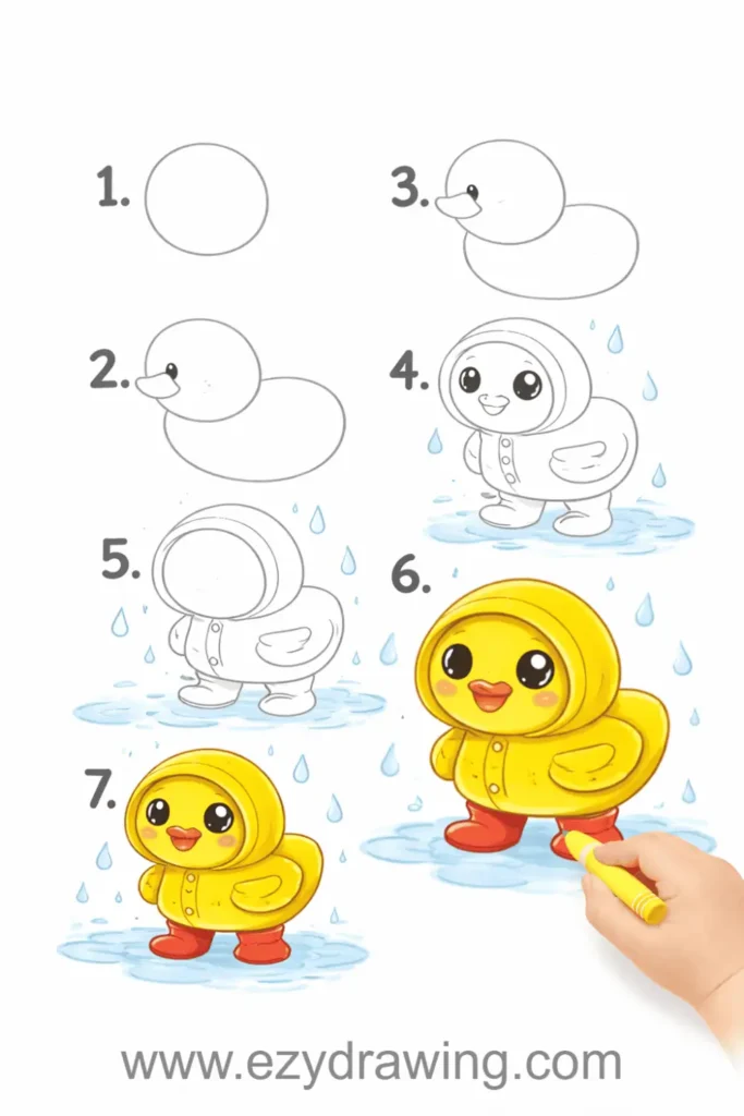 Step 1: Draw basic duck shape with oval body and round head. Step 2: Add a triangular raincoat shape over the body. Step 3: Draw a hood over the duck’s head. Step 4: Sketch tall rain boots on the feet. Step 5: Add raindrops falling around the duck with small teardrop shapes. Step 6: Draw puddles beneath using wavy ovals. Step 7: Color the raincoat yellow and boots red.