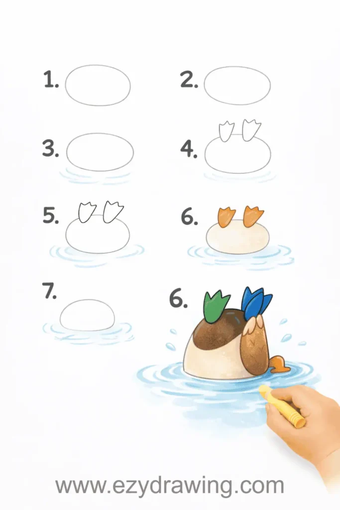 Step 1: Draw the duck’s tail feathers pointing up as an inverted triangle. Step 2: Add the body tilted downward at 45 degrees. Step 3: Sketch small legs sticking straight up. Step 4: Draw wavy water lines across the middle of the duck. Step 5: Add ripples and bubbles around the water line. Step 6: Color the visible tail and legs, keeping the underwater portion lighter or blue-tinted.