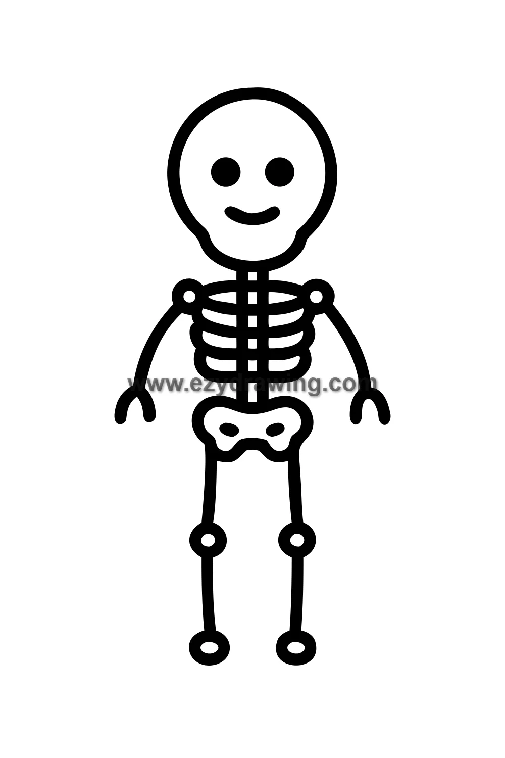 This friendly skeleton stands in the most approachable and welcoming pose imaginable — a gentle smile on its kawaii skull face, all its major bones visible and clearly arranged in their natural relationships. The skull, ribcage, spine, pelvis, and limb bones are all here, presented not as something scary but as the remarkable architectural framework that makes every human movement possible.
