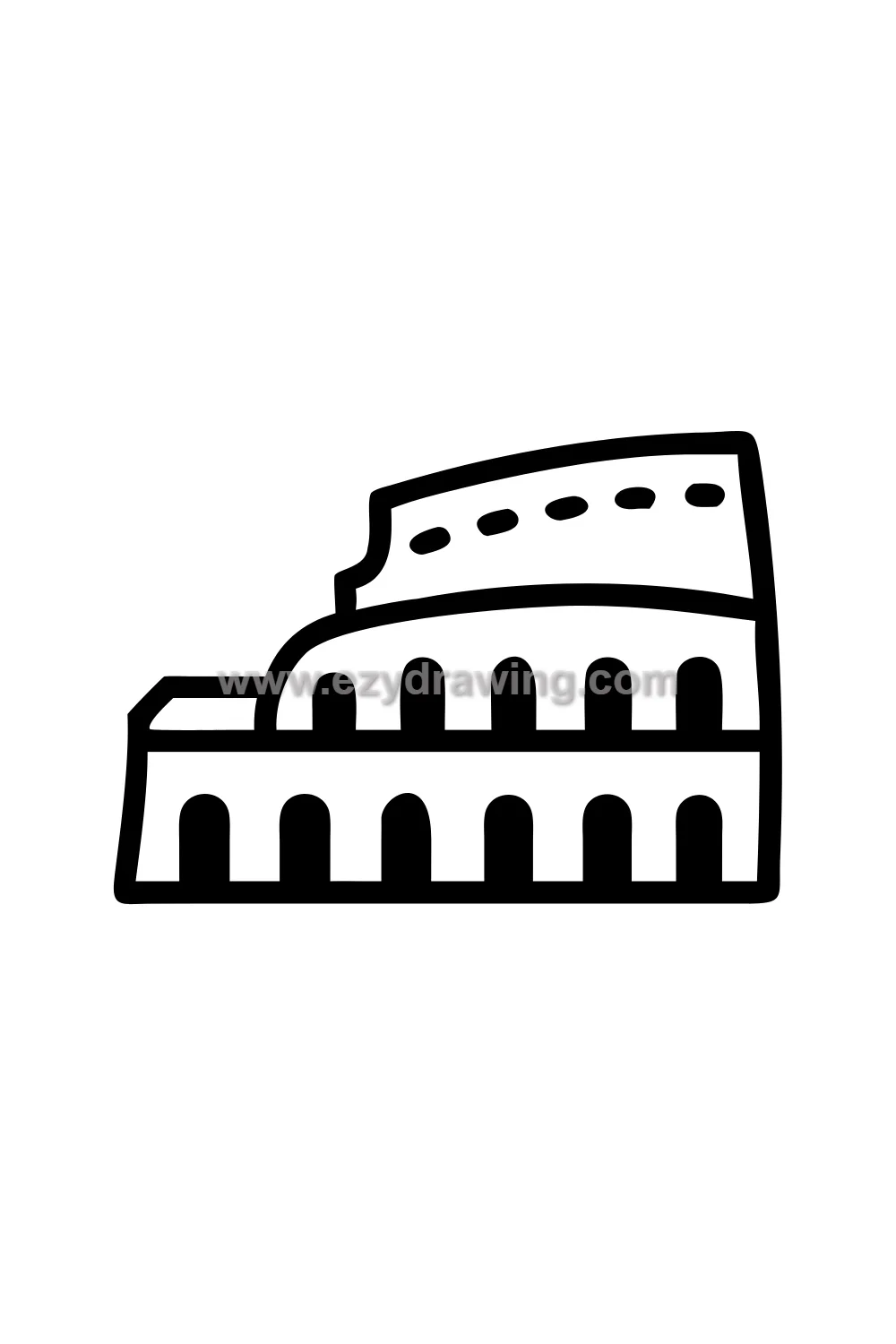 The repeating arch pattern is the defining visual element of the Colosseum — each arch is drawn as a simple semicircle above a rectangular opening, and these arches repeat at regular intervals around the curved building face. The arches in each tier align vertically with those in the tiers above and below, creating the beautiful rhythmic grid that makes the Colosseum so visually distinctive.