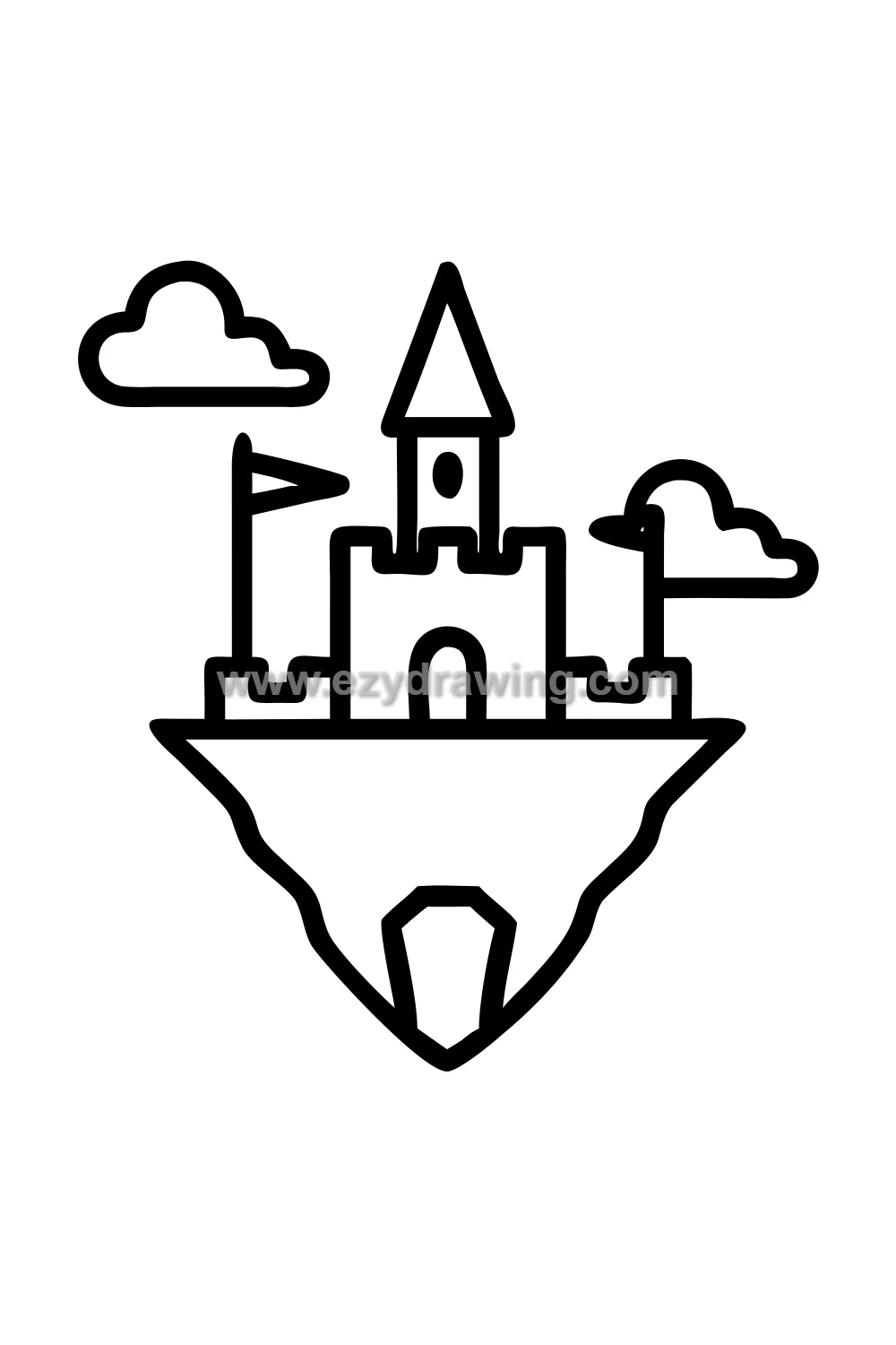 The castle silhouette is the most important element to establish first — the varied heights of the towers against the sky create the characteristic jagged outline that makes castles immediately recognizable even as a pure silhouette. The tallest tower should be clearly dominant, with supporting towers at different heights creating visual rhythm around it.