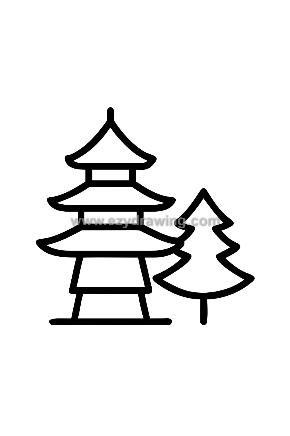 The tiered roof construction is the defining challenge and the defining beauty of pagoda drawing — each tier is essentially a simple trapezoid with upturned ends, stacked in decreasing sizes from bottom to top. The upturned corners are drawn as simple curves sweeping upward at the end of each roof line, and this single curved detail transforms a plain trapezoid into unmistakably Japanese architecture.