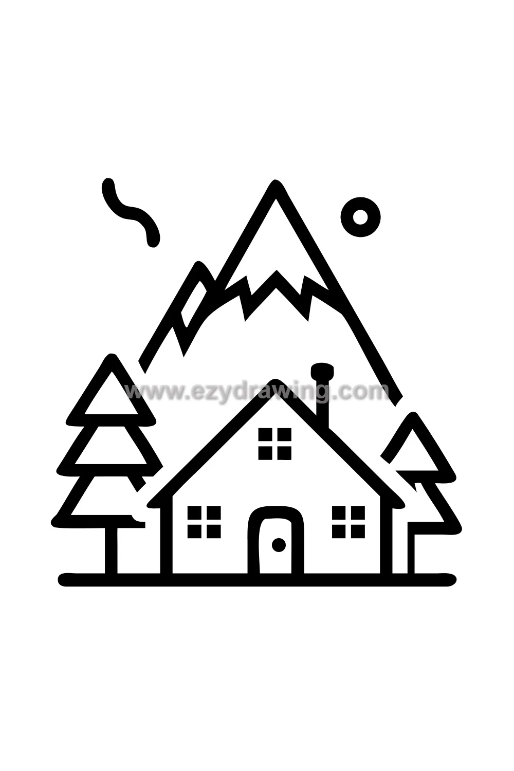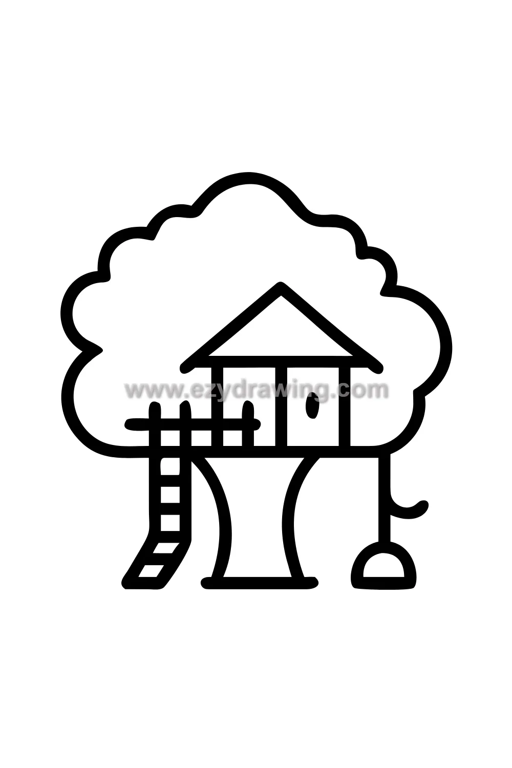 The treehouse drawing requires establishing the tree structure first — the thick trunk dividing into major branches that provide the platforms for the house. The house itself is then drawn as a simple wooden structure fitting between and around these branches, the irregularity of the branches giving the architecture its organic and magical quality that no ground-based building can achieve.