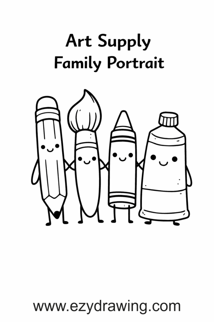 The art supply family has gathered for their official portrait — a tall confident pencil, an elegant paintbrush, a cheerful chubby eraser, a serious straight-backed ruler, and an excitable paint tube, all lined up from tallest to shortest with their very best expressions. Every supply has a completely unique personality.