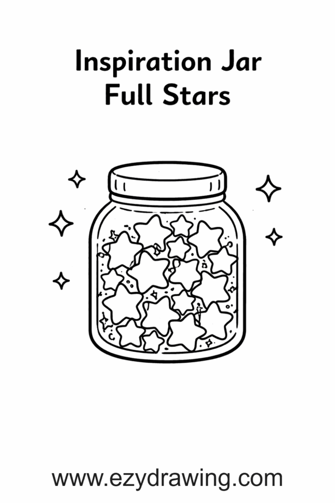 The mason jar is one of the most charming and beginner-friendly shapes to draw: a simple rounded rectangular body with a slightly wider middle, a screw-top lid, and a small handle loop on the side. The glowing contents are suggested by simple small shapes — stars, hearts, circles — drawn inside the jar outline.