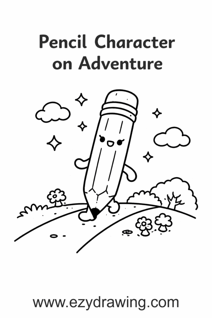 A cheerful pencil character strides confidently across the page on tiny stick legs, its eraser-end face grinning with purpose as it leaves a beautiful trail of stars, swirls, and small doodles in its wake — turning its very journey into a work of art.