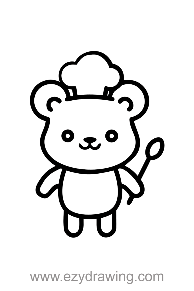 The bear’s happy proud eyes and big smile show confidence and passion for cooking, while one paw grips a wooden spoon ready for stirring and mixing. The classic puffy chef’s hat sits perfectly atop the bear’s rounded ears.
