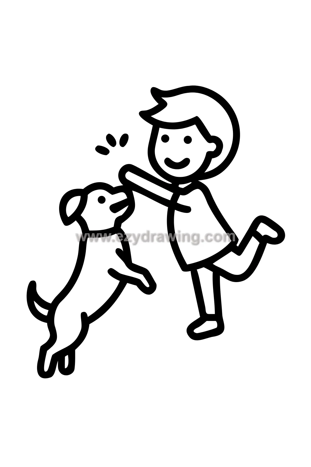 The dog jumping up pose creates a wonderful two-figure composition with an unusual dynamic — the dog is partly vertical rather than on all four legs, which brings the two faces closer together in the composition and creates a feeling of genuine equal-to-equal interaction. The matching happiness on both faces is the emotional heart of the drawing.
