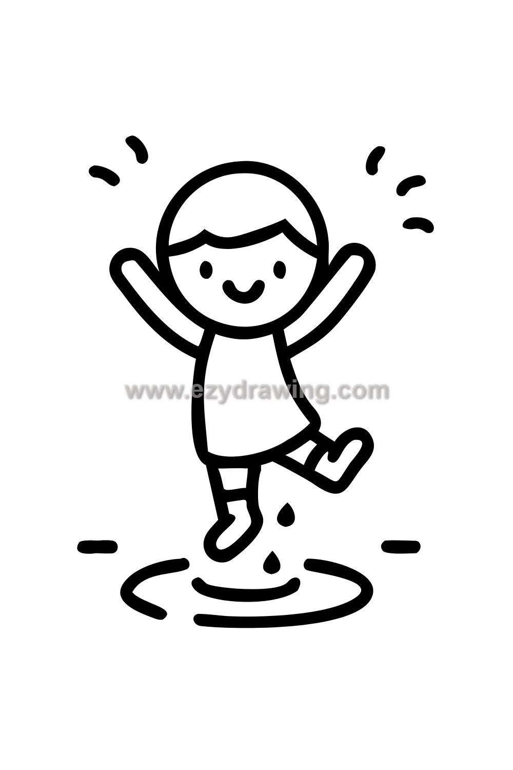 The puddle jump is one of the most joyful and universally recognized childhood moments in all of human experience, and drawing it requires capturing the specific mid-air instant where the feet are above the puddle and the splash has just begun. The radiating splash lines around the puddle point communicate the impact and the enthusiasm of the jump simultaneously.