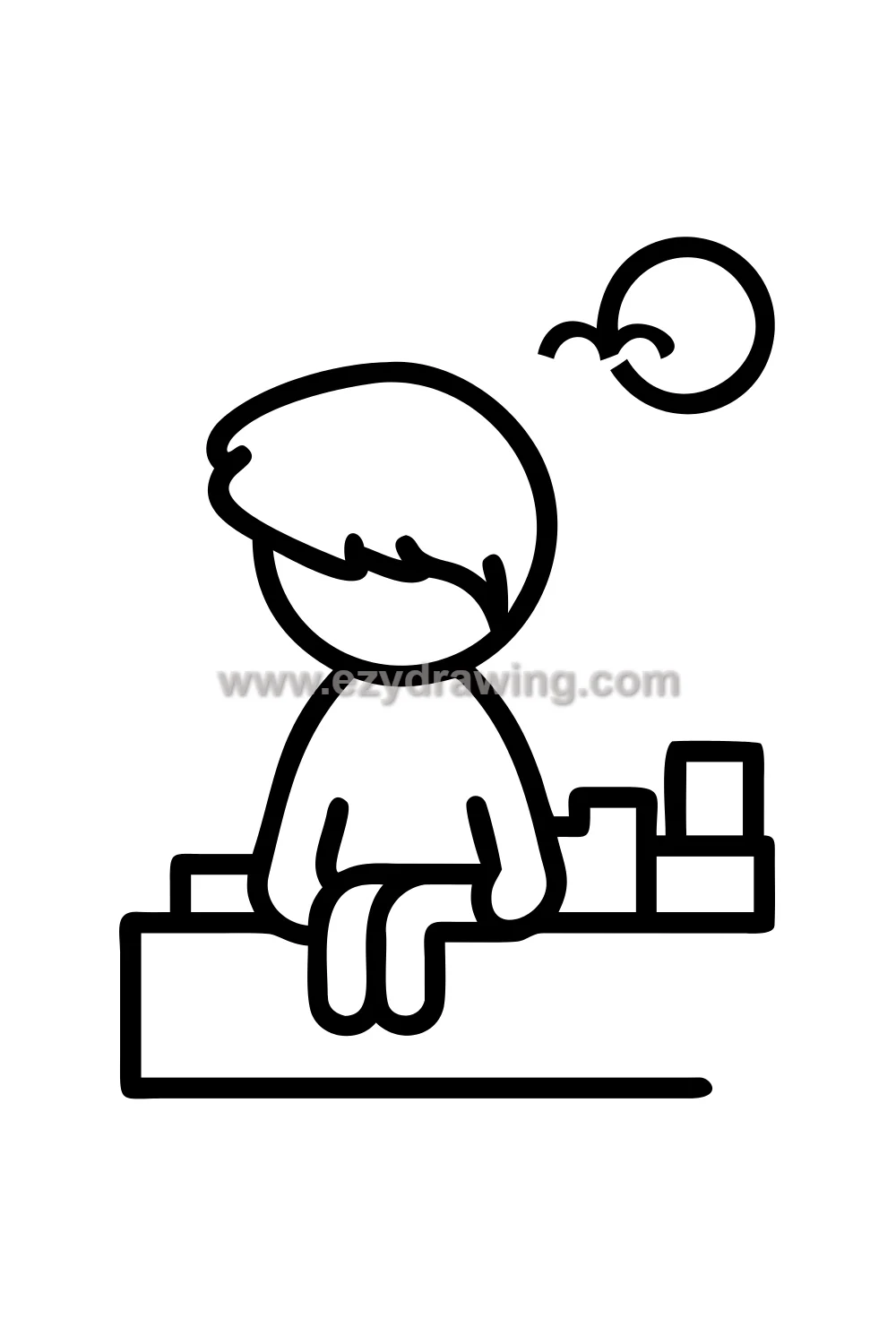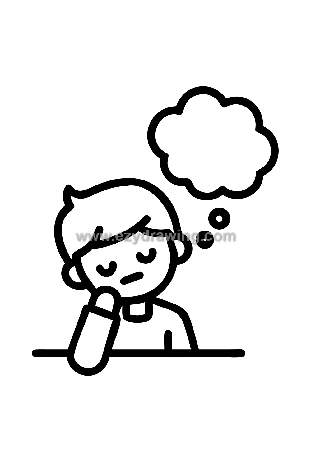 The thought bubble is the storytelling device that makes this drawing personal and specific — the images inside can be anything, from an adventure scene to a favourite food to a faraway place, and the specific contents tell the viewer everything about what kind of daydreamer this particular boy is. Small simple images work best inside the bubble.