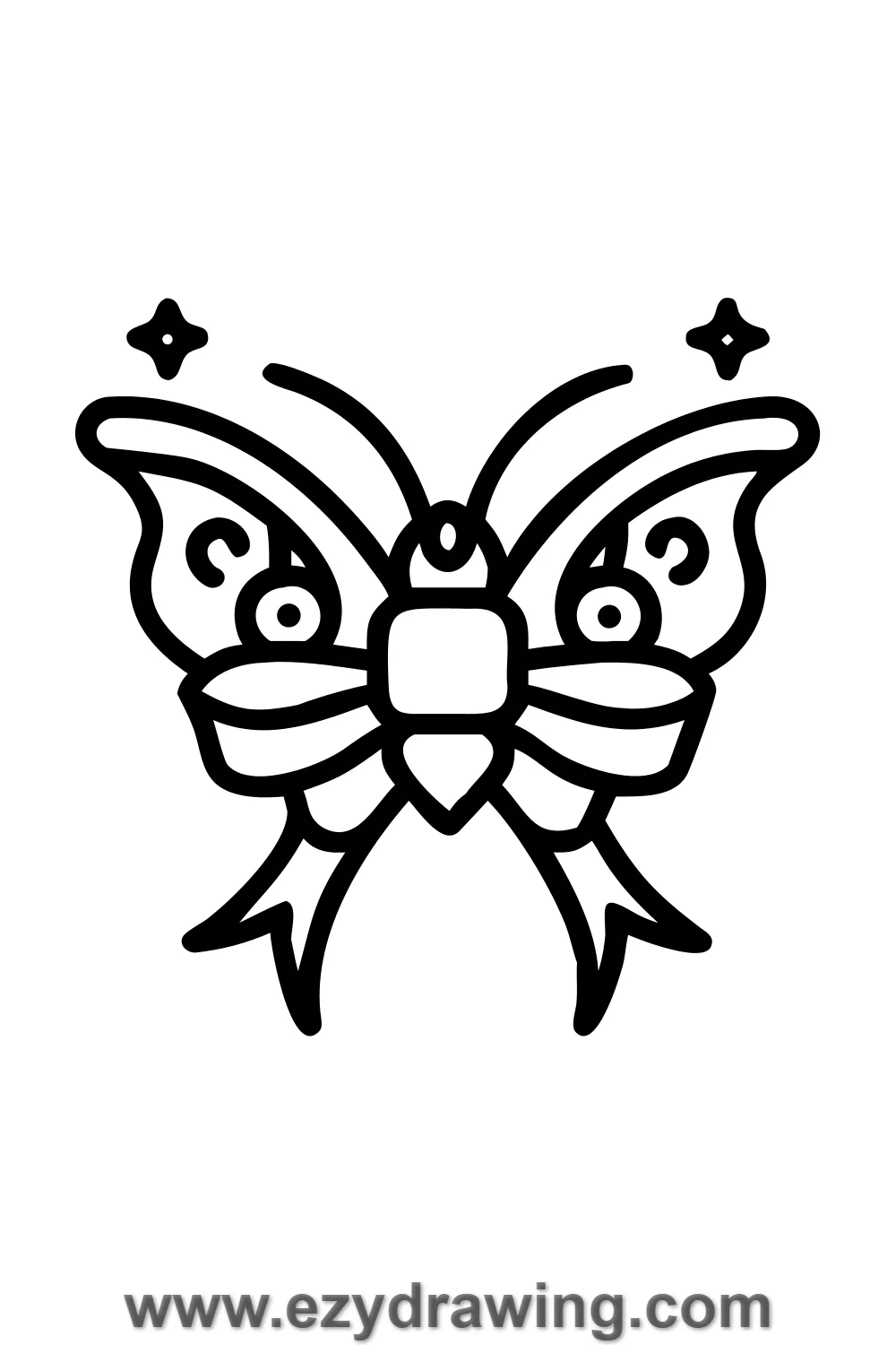 Mirror the same pattern on both sides to keep the design perfectly symmetrical. Draw a curved ribbon banner flowing beneath the butterfly body with scroll ends on each side.
