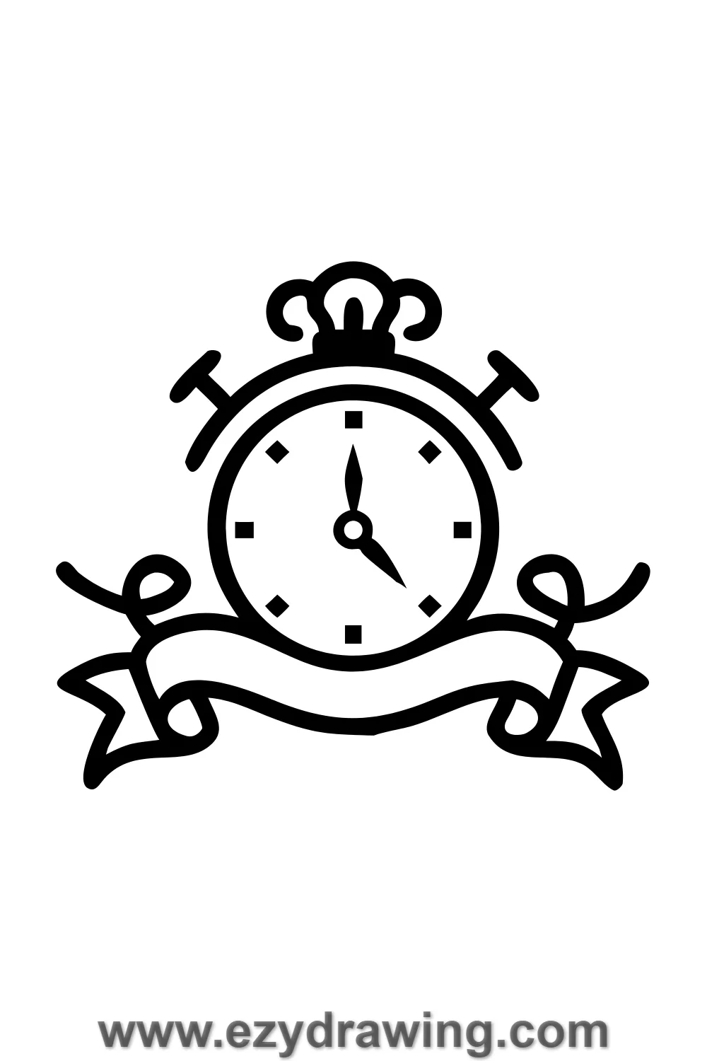 Add a decorative chain link at the top of the clock. Below the clock, draw a curved ribbon banner with scroll ends on each side.