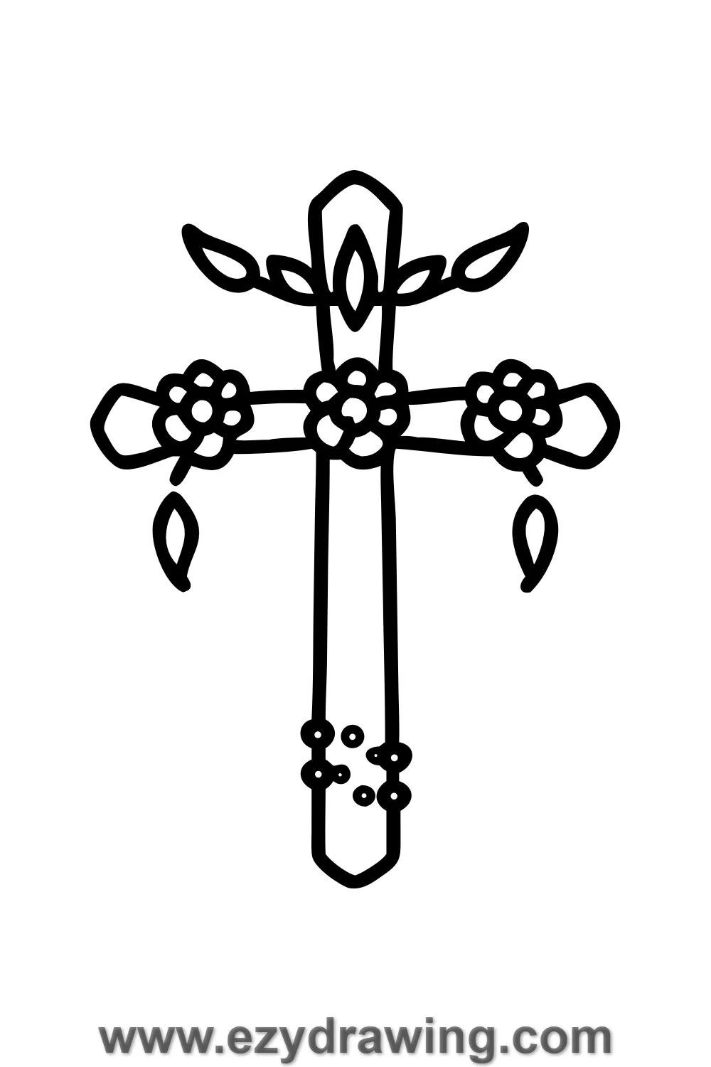 Add shading lines running lengthwise along each arm to give the cross a dimensional look. Wrap climbing rose stems with leaves around the vertical arm of the cross.