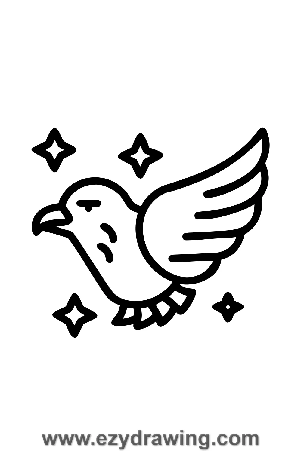 Draw a fanned tail at the bottom with matching feather lines. Scatter small decorative stars around the spread wings to complete this bold easy Chicano drawing. 🦅⭐🔥