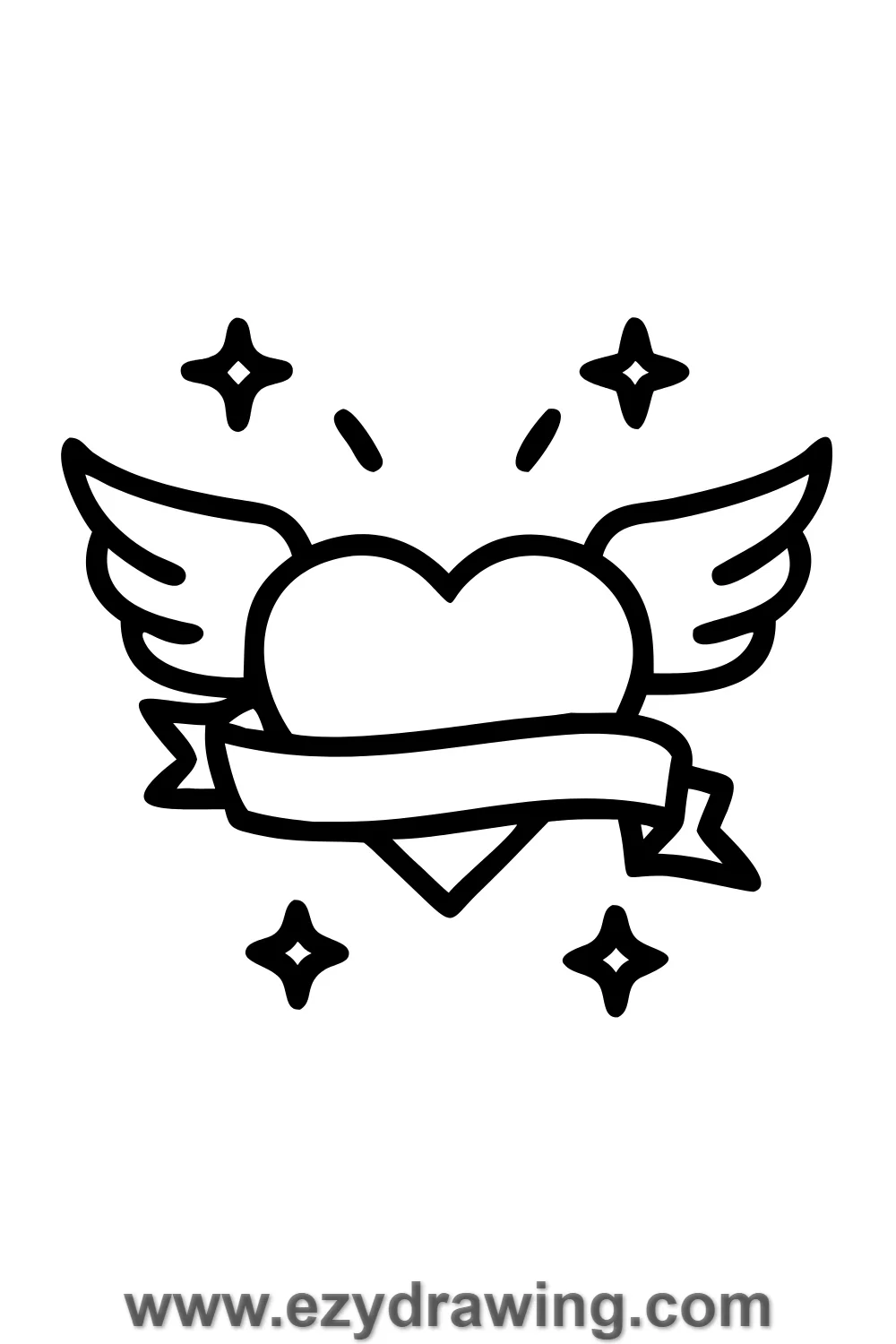 Add shading lines curving across the heart surface to give it dimension and depth. Draw a pair of large angel wings extending outward from each side of the heart.