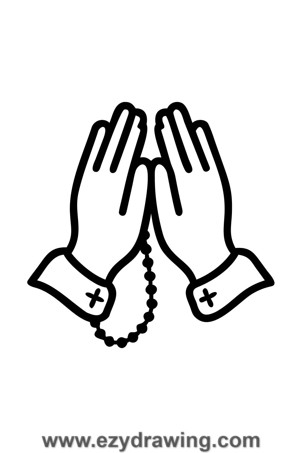 Wrap a rosary chain around the wrists using evenly spaced small circles for beads. Draw a small detailed cross hanging at the bottom of the chain.