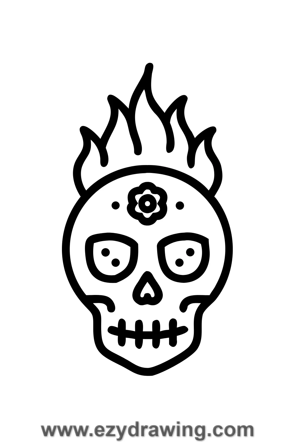 Place a crown shape on top of the skull and add tall flame shapes rising above it. Decorate the forehead with symmetrical dot and line patterns.