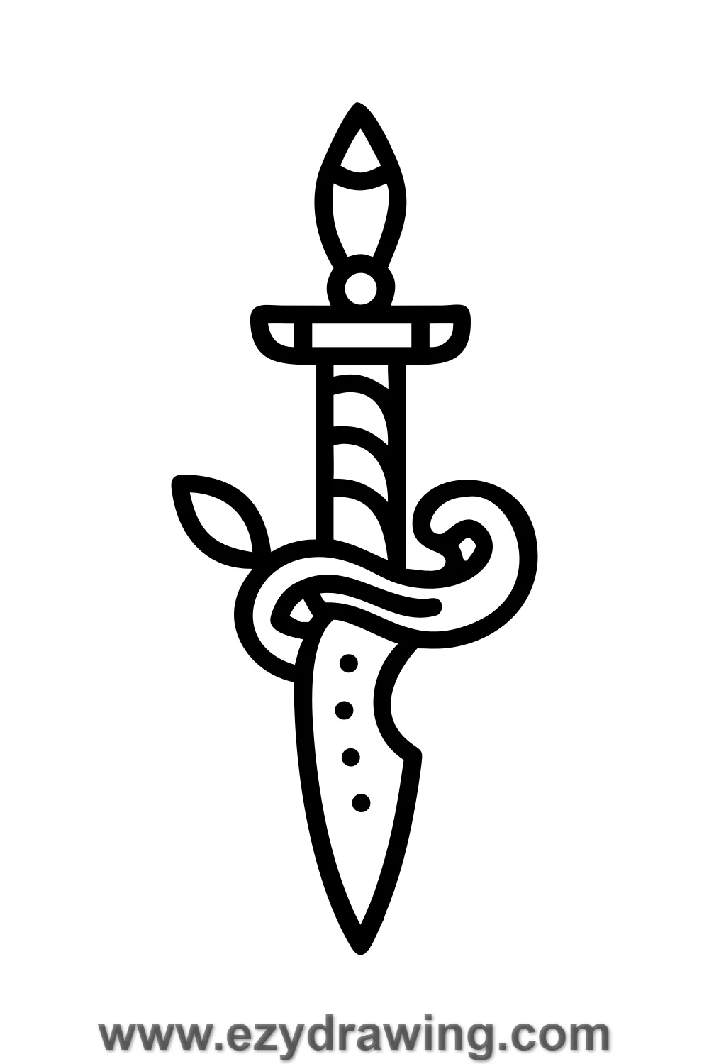 Add a scale pattern along the snake body using small overlapping U-shapes. Raise the snake’s head above the dagger tip with a forked tongue extending outward.