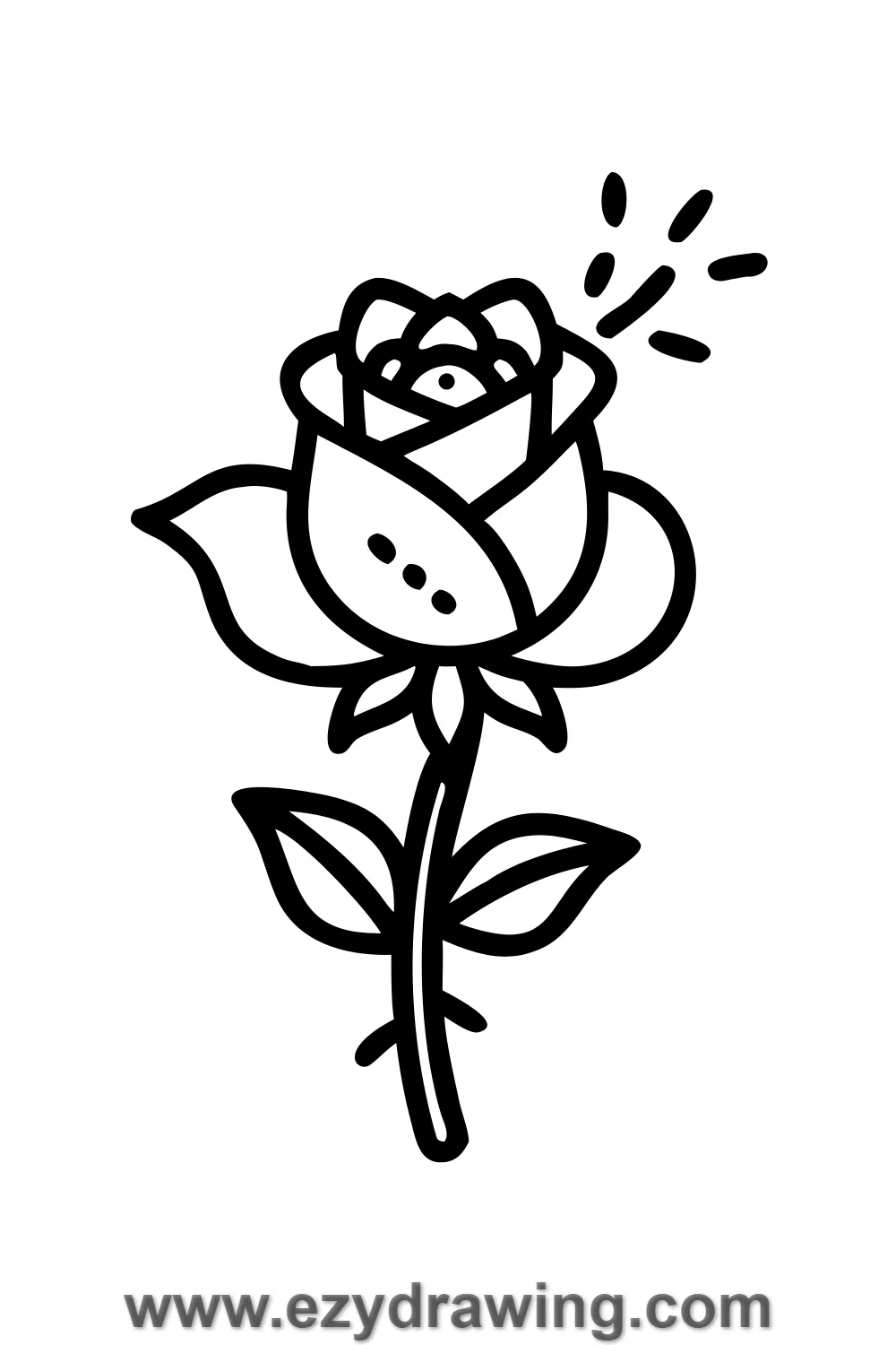 Draw two thorny stems crossing below the flower. Add two large pointed leaves on either side of the stems.