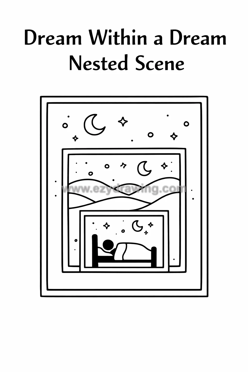 The nested structure naturally creates a progressive diminishment — each level smaller than the one before, each dream bubble contained within the previous sleeping figure’s thought. The slight variation in drawing style between levels — perhaps the outermost most detailed and realistic, the inner levels progressively more simplified or surreal — reinforces the sense of increasing remove from waking reality.