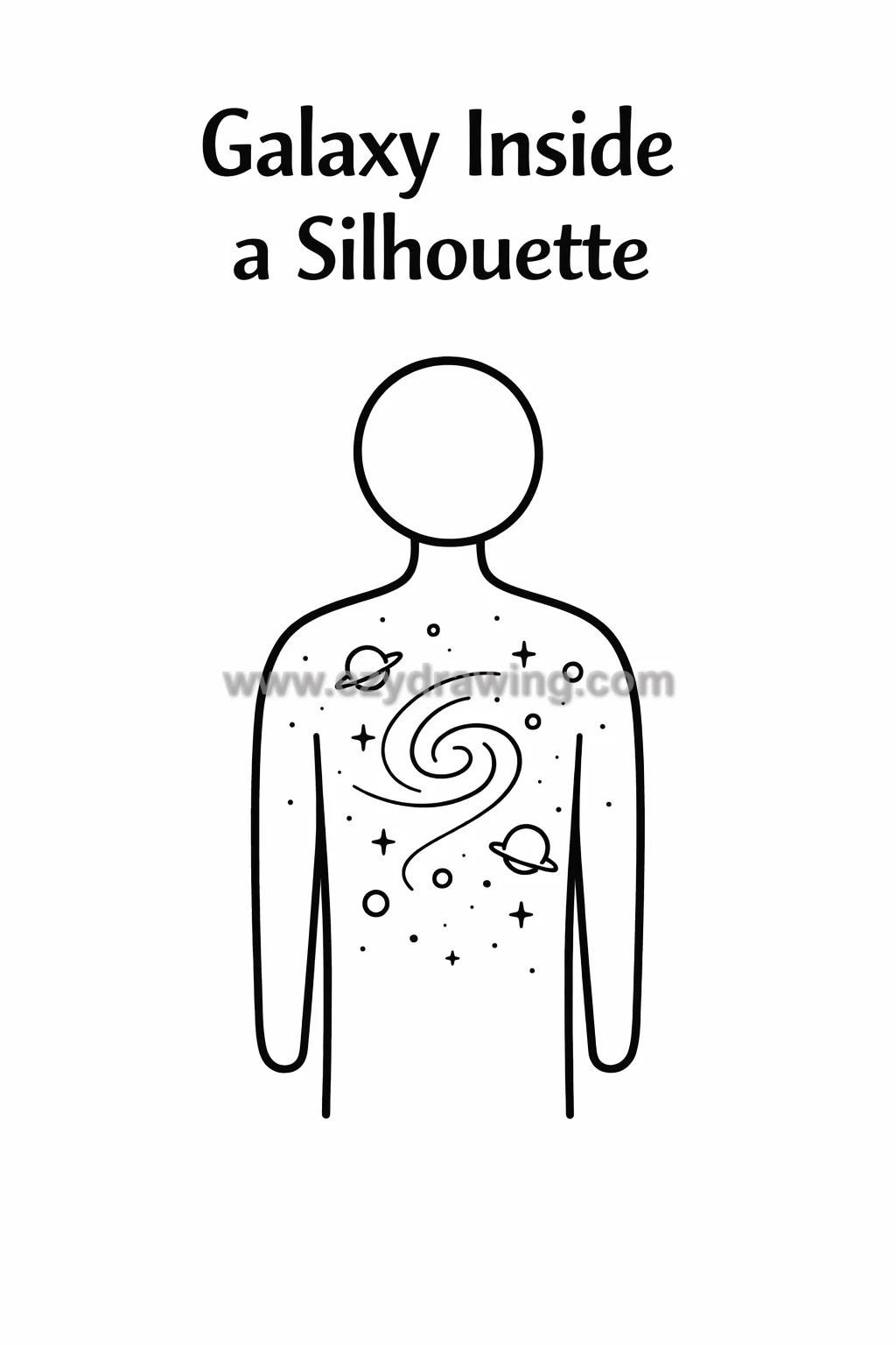 The silhouette galaxy drawing works through maximum contrast — the complex, detailed, multi-toned interior of the galaxy against the clean simple outer edge of the silhouette, and both of these against the completely plain background. The complexity lives inside the shape, the emptiness lives outside it, and this inside-outside contrast is the entire concept made visual.