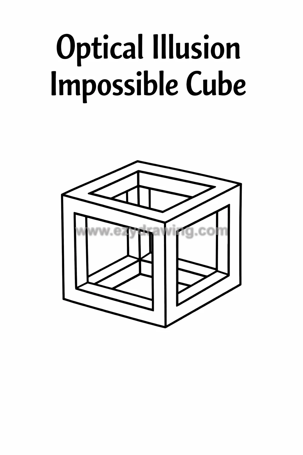The impossible cube is drawn using standard isometric perspective for most of its edges, with one or two edges deliberately reversed so they simultaneously belong to both the front and back of the cube. The clean, precise line quality is essential — the illusion works through geometric clarity, and any looseness or uncertainty in the lines weakens the contradictory spatial reading.