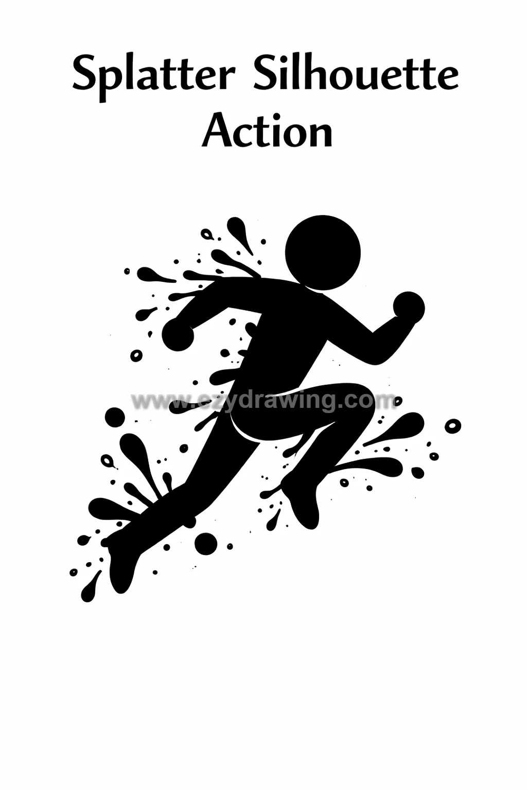 A dynamic action figure — a martial artist mid-kick, a dancer mid-leap, an athlete mid-throw — rendered as a solid bold silhouette, and from the most energetically charged points of the pose, explosive paint splatter marks radiate outward as if the physical force of the action has materialized as visible energy. The figure’s power becomes visible paint in the air around it.