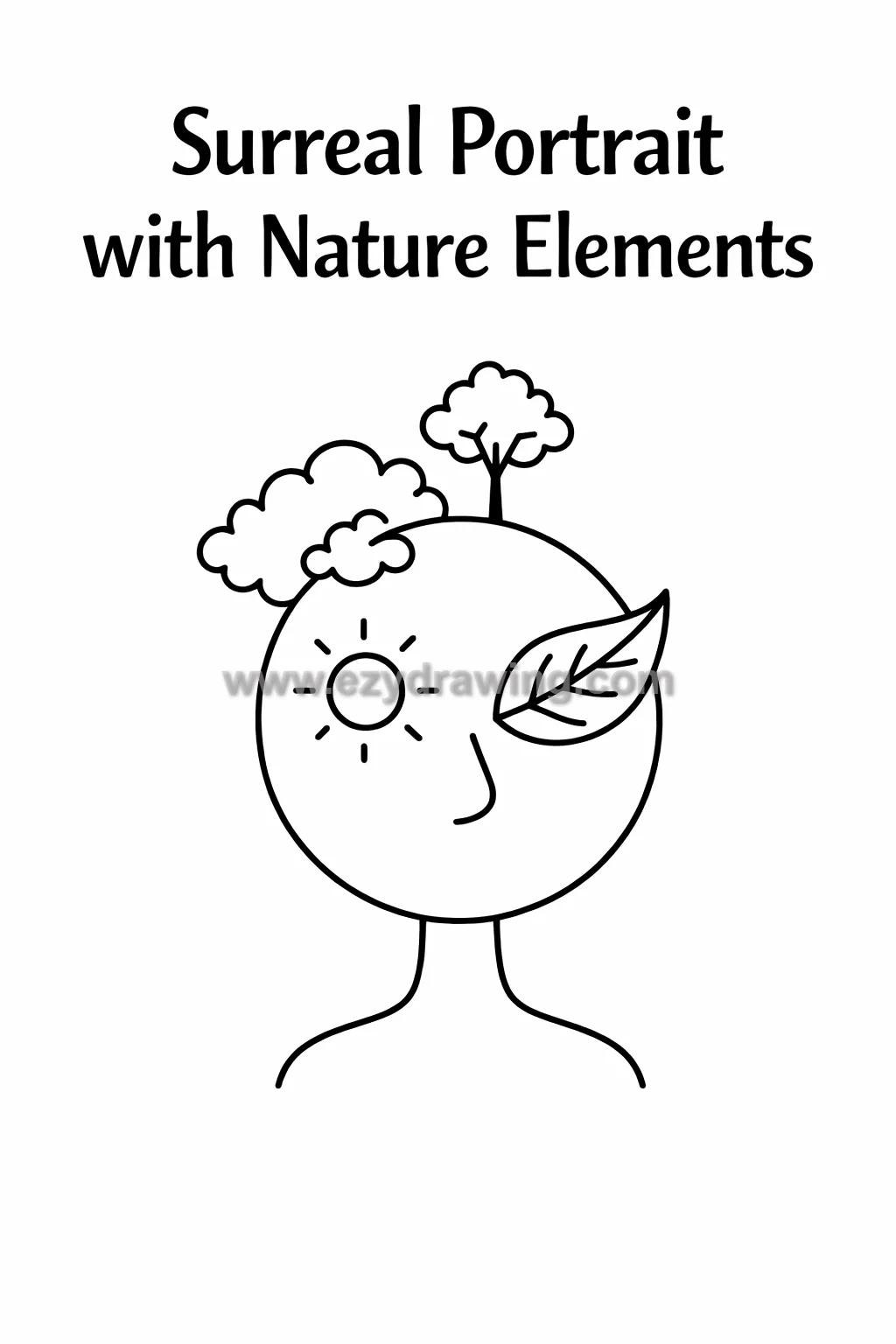 The surreal portrait achieves its effect through the precise and committed drawing of impossible combinations — each natural element is drawn with genuine botanical or natural accuracy, the face itself is drawn with portrait seriousness, and the meeting points between human and natural are handled matter-of-factly rather than with exaggerated drama. The calm acceptance of the impossible is what makes surrealism work.