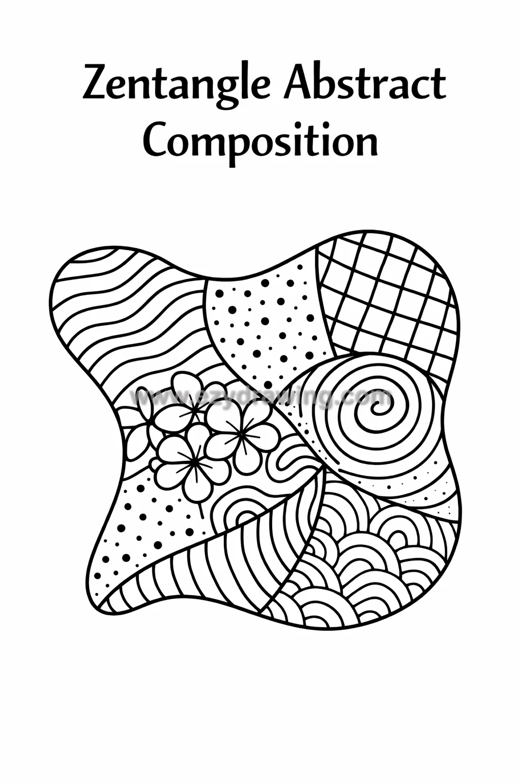 An organic irregular shape is divided by flowing internal lines into a collection of sections, and each section is filled with a completely different zentangle pattern — crosshatch, scale, spiral, wave, brick, dot, and more — the variety of textures creating a richly complex finished composition built entirely from the simplest possible individual marks repeated with meditative consistency.