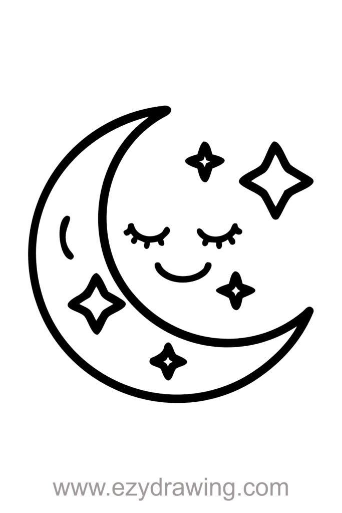Illustrate a peaceful crescent moon taking a gentle rest to create a calm and dreamy mood. This soothing doodle with closed eyes and tiny stars is perfect for nighttime themed pages. Soft curves make it beginner friendly and relaxing to draw.