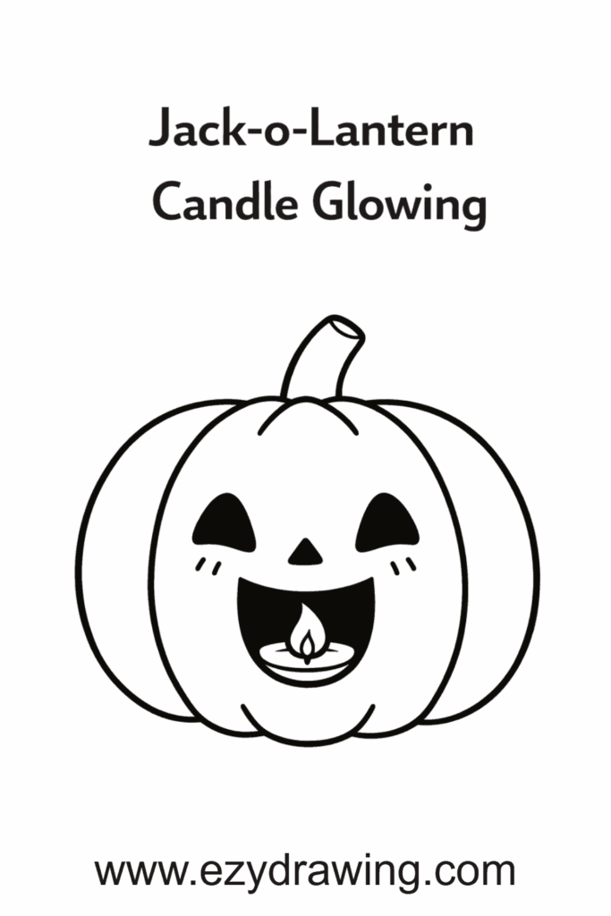 The small candle flame visible inside the pumpkin through the carved mouth opening is a wonderful detail that connects this drawing to the candle fire theme — it’s the hidden heart that makes the whole jack-o-lantern come alive. The glow effect radiating from the carved openings uses simple concentric line rings.