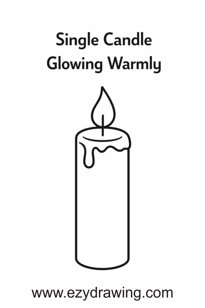 The candle is drawn as a simple tall cylinder with a short wick line at the top, and the flame above it is a neat teardrop shape with a pointed tip. The most important detail is the glow — concentric circular lines radiating softly outward from the flame base, which is simple to draw but transforms the whole atmosphere.