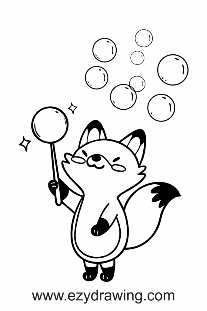 Draw a playful fox having fun blowing bubbles on a sunny day. The fox holds a bubble wand and is surrounded by floating bubbles of various sizes, each one catching the light. This lighthearted scene captures the simple joy of play and childhood fun.