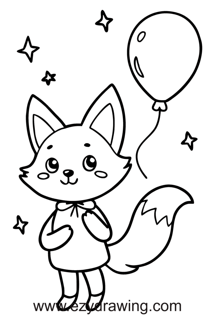 Create a joyful scene of a fox holding a festive balloon, looking up with pure happiness. The fox stands on its hind legs with a big smile, watching the balloon float gently in the air. This cheerful drawing captures a moment of simple joy and celebration!