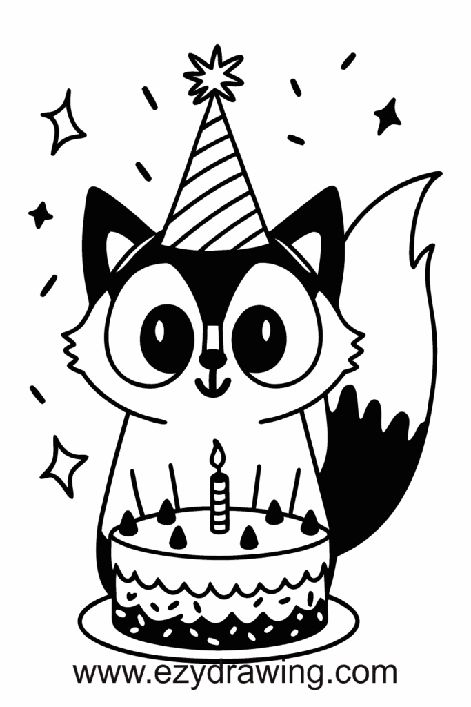 Create a festive fox celebrating a special birthday! The fox wears a colorful party hat and sits eagerly in front of a delicious cake topped with a single candle. This joyful scene is perfect for birthday cards or celebration-themed artwork.