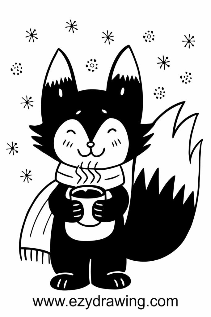 Draw a stylish fox bundled up in a cozy striped scarf, ready for a chilly winter day. The fox sits comfortably with the scarf wrapped snugly around its neck, looking warm and fashionable. This charming winter scene captures the fox’s adorable personality!