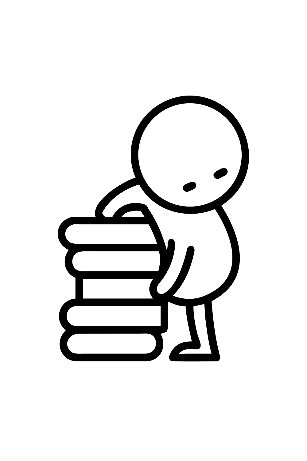 Make the book stack lean dangerously to one side to add comic tension. Draw a small sweat drop above the head and puffed cheeks on the straining face.