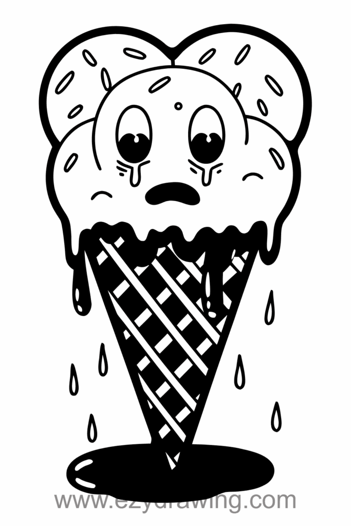 Illustrate the comedic tragedy of a melting ice cream cone with a worried face. This dessert’s panicked expression as it slowly melts creates both humor and sympathetic laughter at its predicament.