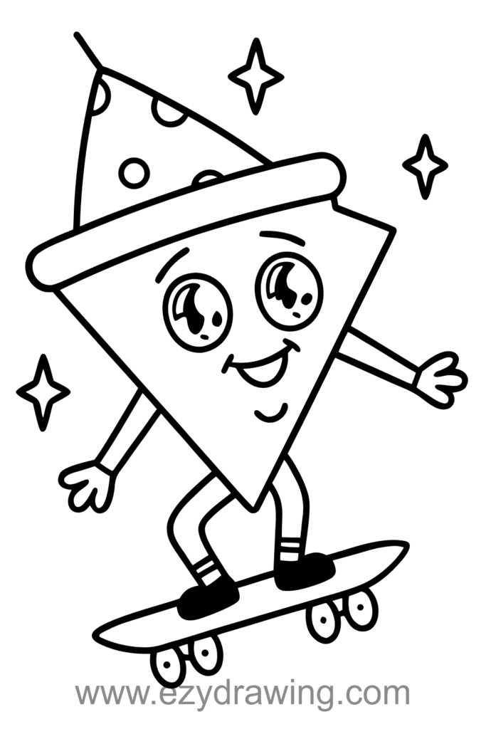 Create a radical pizza slice shredding on a skateboard! This extreme sports food item combines two beloved things in the most absurd way possible, resulting in pure silly fun.