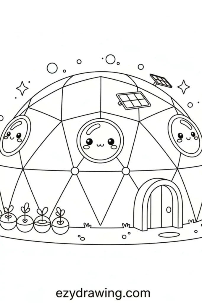 Sketch an innovative dome house from the future! The curved structure teaches about alternative architecture and how geometric shapes create efficient living spaces.
