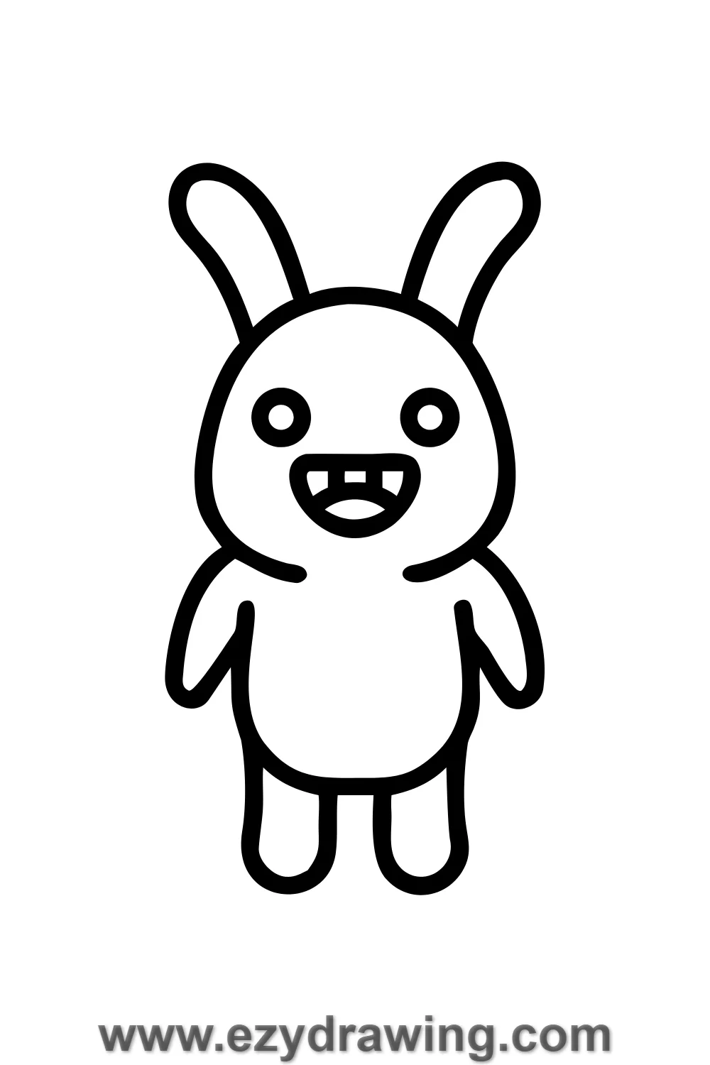 The face is the most important part to get right, and it’s simpler than it looks — the eyes are two large solid black circles with a small white highlight dot in each, and the signature grin is a wide curved shape filled with multiple pointed zigzag teeth along the top edge. The ears stand tall above the head, each one a simple elongated oval with a pointed tip, and the overall head shape is a large, soft circle that anchors the whole design.