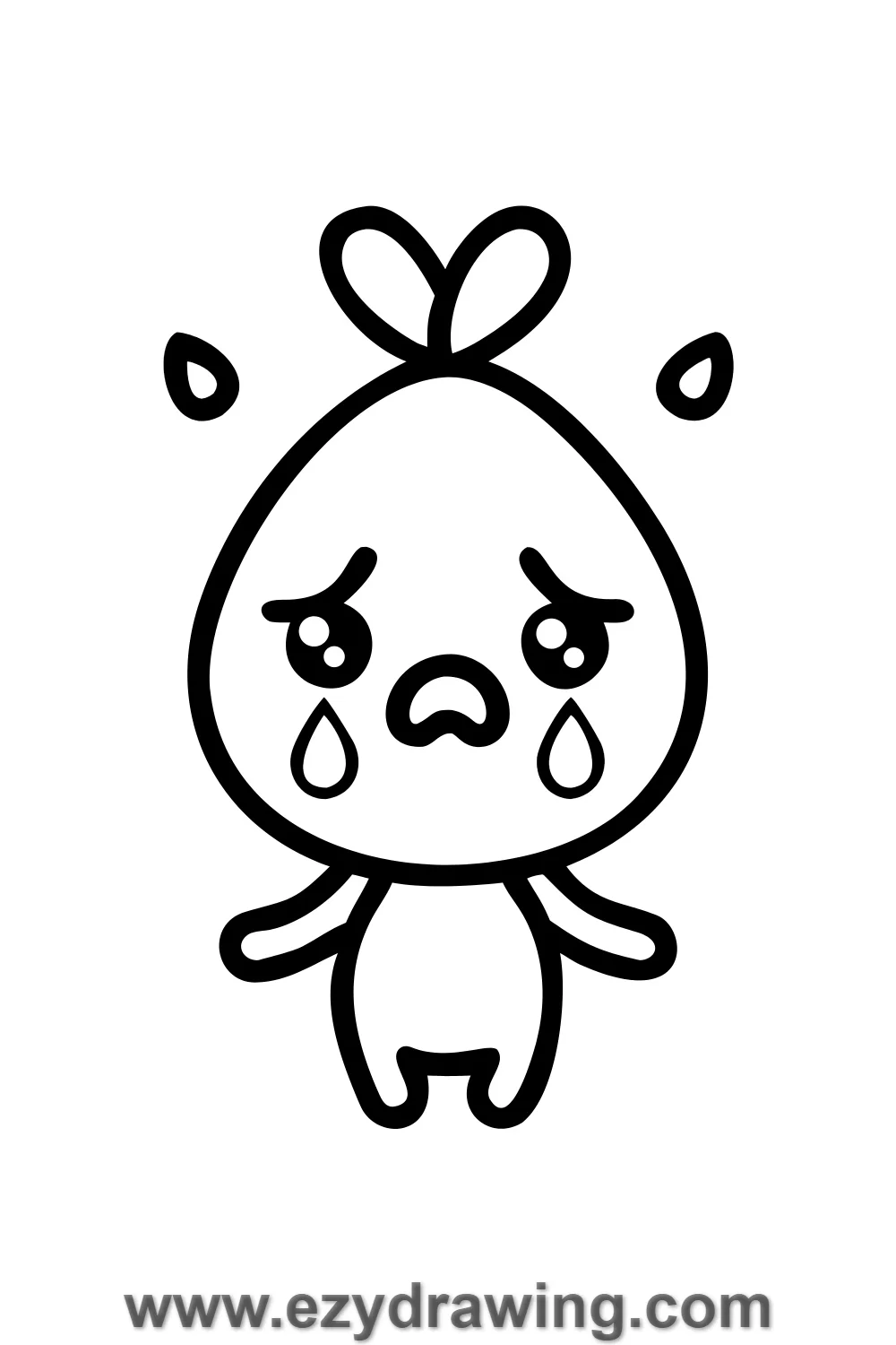 One of the most expressive and emotionally rich Labubu drawing ideas on this list — and arguably one of the funniest — is the dramatically crying Labubu! The expression is exaggerated to full kawaii cartoon extremes: enormous watery eyes brimming with glassy tears, a trembling jutted-out lower lip, and rivers of tears streaming down both cheeks in thick cartoon curves. Large individual teardrop shapes fall around the figure like dramatic rainfall, making the whole scene feel both genuinely emotional and wonderfully over-the-top.