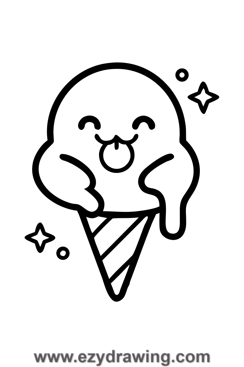 Pure joy, captured in a single drawing — this easy Labubu drawing idea shows the character in one of the most universally relatable happy moments: eating a delicious ice cream cone! The composition is compact and centered, with Labubu’s round body framing the large ice cream cone held up in front, the enormous pink scoop dominating the upper portion of the image. A small drip runs down the side of the cone from the warming scoop, adding a sense of urgency and summer heat to the scene.