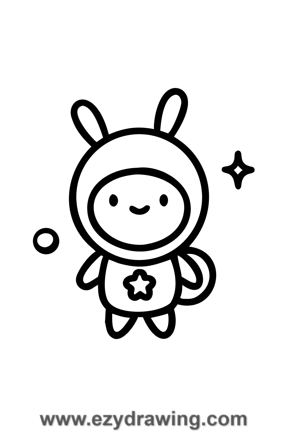 Labubu has left the atmosphere and this space-themed drawing idea is one of the most imaginative and visually exciting cute Labubu drawings on the entire list! The bubble helmet is the compositional star — a large perfect circle encasing Labubu’s round head, with those distinctive pointy ears pressing comically against the inside of the glass because they simply don’t fit neatly inside a standard helmet. The puffy spacesuit body extends below with a small star badge on the chest, and the whole figure floats against a starry backdrop.