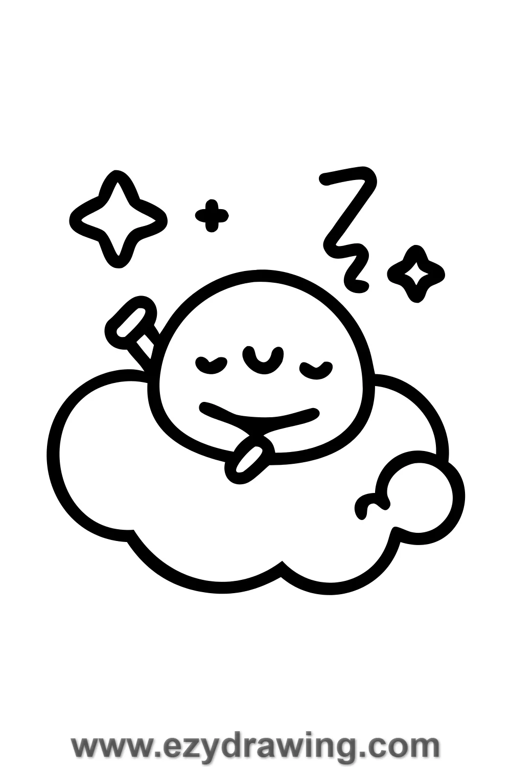 Peaceful, dreamy, and completely adorable — this Labubu drawing idea catches the character in one of its rarest moods: completely and utterly asleep! The cloud forms the soft base of the composition, drawn as a classic cartoon cloud shape with overlapping rounded bumps along the top edge and a flat bottom. Labubu lies sprawled on its back across the cloud, limbs extended in that universal pose of someone who has absolutely nothing to worry about and knows it.