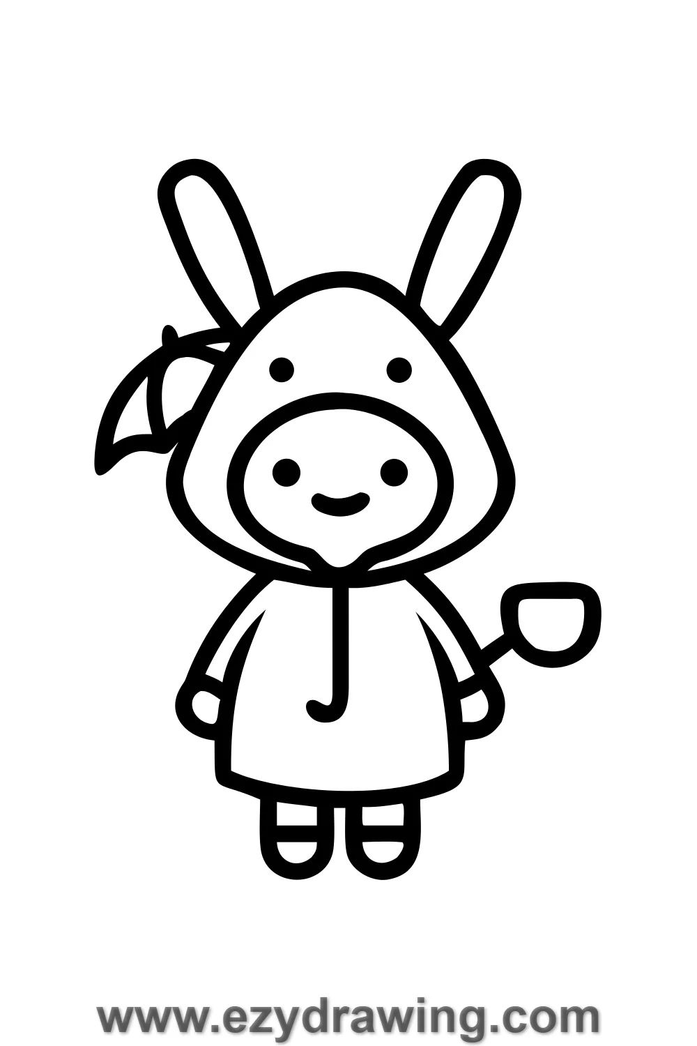 This wonderfully cozy and unexpected Labubu drawing idea dresses our favorite spiky creature in the most iconic rainy-day outfit — an oversized yellow hooded raincoat with matching rubber boots, umbrella in hand and grinning ear to ear despite the rain! The composition is centered and upright, with the bright yellow coat covering most of Labubu’s body, the hood pulled up over those signature pointy ears so just the tips poke out from the sides. Raindrops fall in simple diagonal lines around the figure, and small puddle circles sit at the feet.