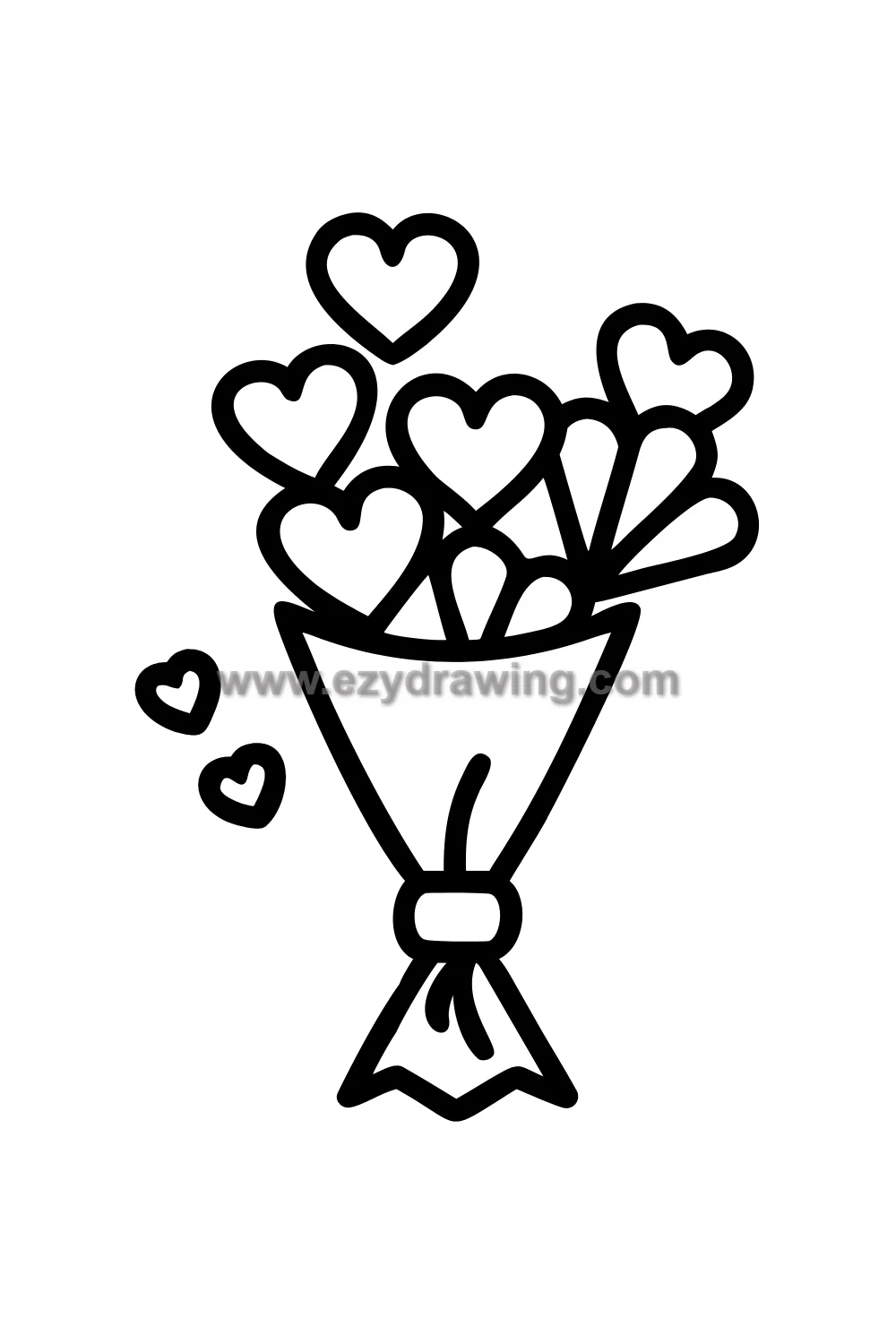 The bouquet composition is built from the outside shape inward — the overall rounded silhouette established first, then individual flower heads placed to fill it, then stems gathered and wrapped below, then ribbon and bow added at the wrap point. The small floating hearts around the finished bouquet are scattered freely in the space around it, each one a simple outline heart shape at a slightly different angle.