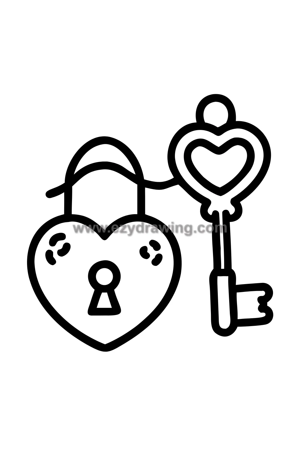 The heart padlock is drawn as a classic padlock body with the heart shape replacing the rectangular case — the shackle arches upward from the sides of the heart as it would on any padlock, and the keyhole sits centered in the lower half of the heart. The ornate vintage key is drawn with a decorative round bow, a long stem, and teeth at the end, the bow echoing the heart shape of the lock it opens.